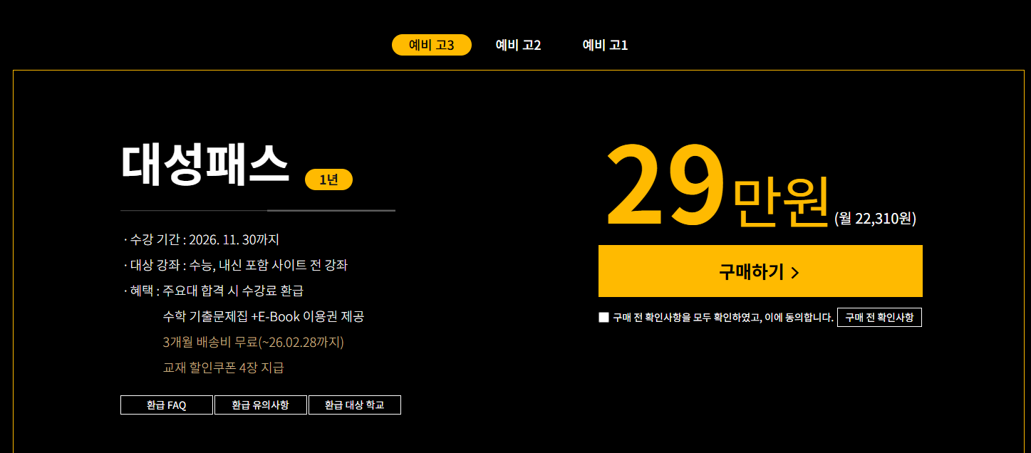 교재 캐시 포함 옵션과 환급형 조건이 있어, 특정 대학·전공 합격 시 수강료 환급을 받을 수 있다는 장점이 있습니다.