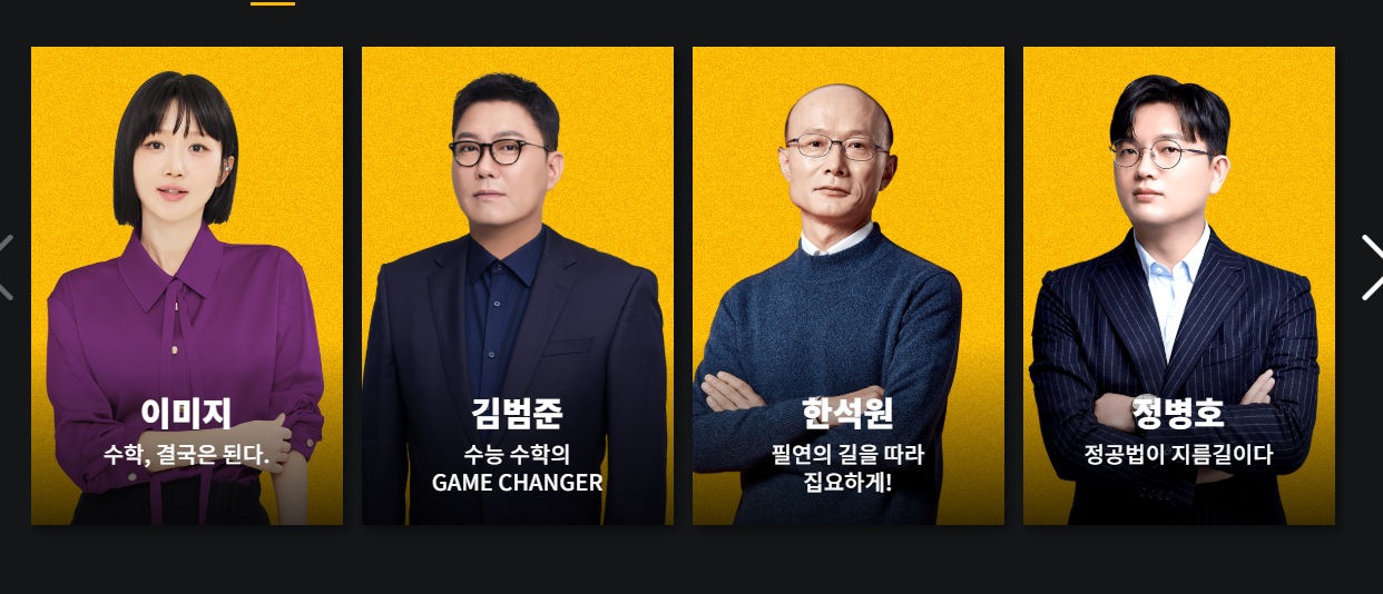• 국어 : 김승리,유대종            영어: 이명학, 션티       수학: 이미지, 한석원,  김범준, 정병호 등 선택 폭이 넓음.